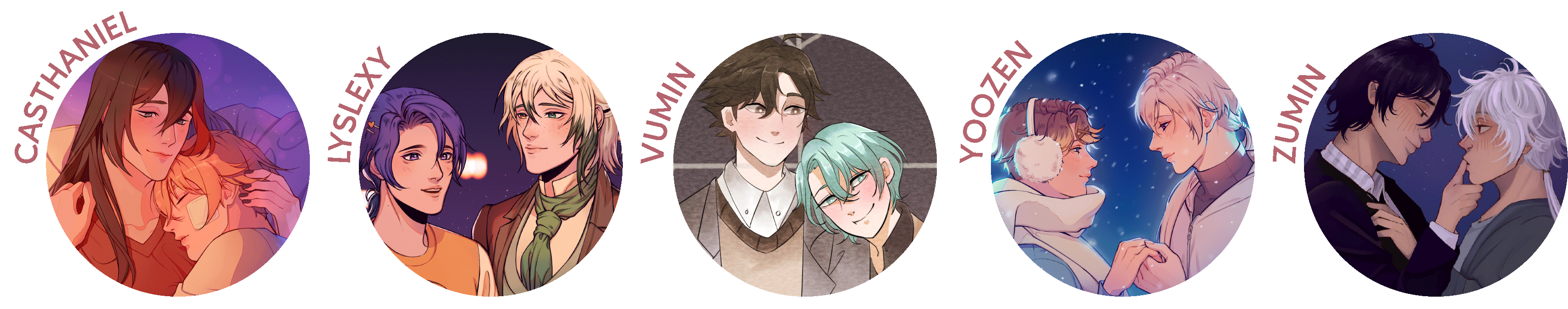 Nischa, Armin/Alexy, V/Yoosung, Choicest, Kenxy, Kenarmin, Jumin/Yoosung, SaeWood, Laloward, Byler, ValAngel, Butchie, SiMarkus, MatchaBlossom, Hannor, Adashi,